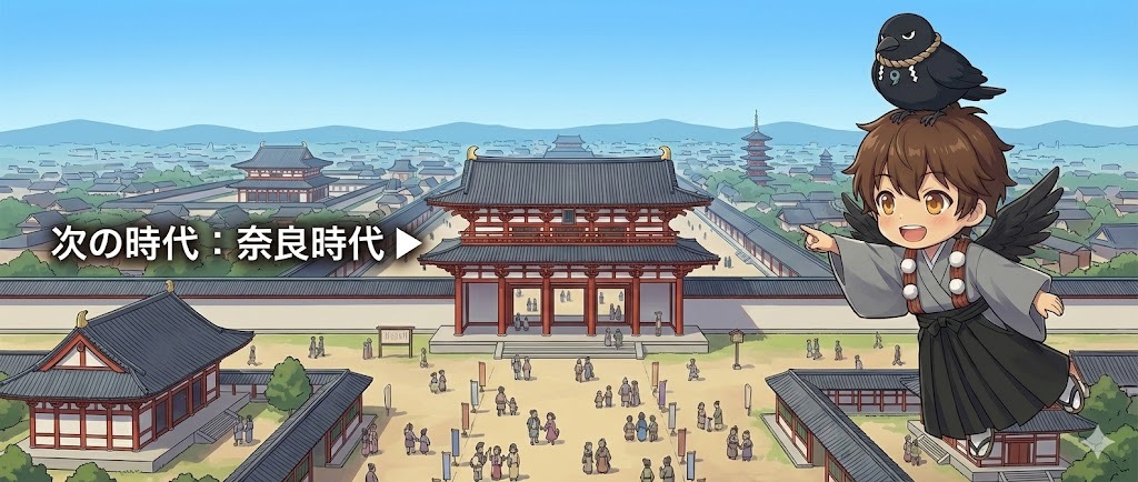 飛鳥時代は、日本という国が、はっきりと形を持ち始めた時代です。 政治・制度・外交・文化——そのすべての基礎が、この時代に築かれました。「誰が動かしたのか(人物)」「何が起きたのか(出来事)」の両方を知ることで、歴史の面白さがさらに深まります。このあと日本史は、奈良時代、平安時代へと進んでいきます。
